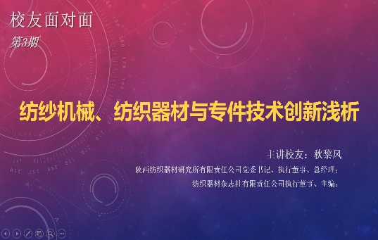 2022年4月22日,我院86级杰出校友、陕西纺织器材研究所党委书记兼总经理、《纺织器材》杂志社(纺织器材行业惟一的全国性科技类综合性期刊、全国纺织工业优秀期刊)主编、教授级高级工程师秋黎凤,应邀在线为我单位做《纺纱机械、纺织器材与专件技术创新浅析》专题报告。东华大学副校长陈革,院教授委员会主任朱世根,院长、纺织装备教育部工程研究中心主任单鸿波,副院长周其洪、裴泽光等学院班子成员,部分中青年教师、行业技术专家、博硕士研究生等线上参加了本次报告会。报告会由学院校友会副秘书长李姝佳主持。